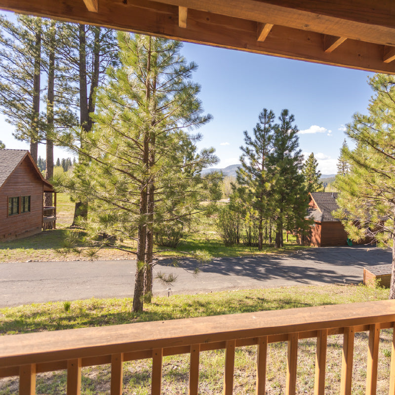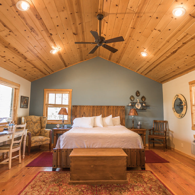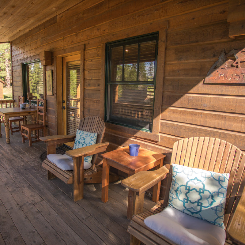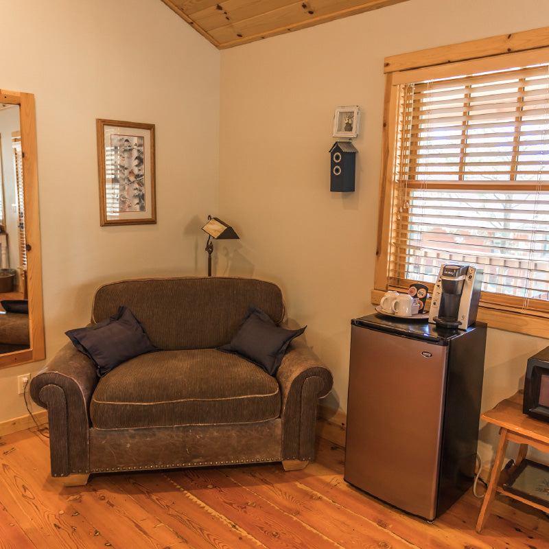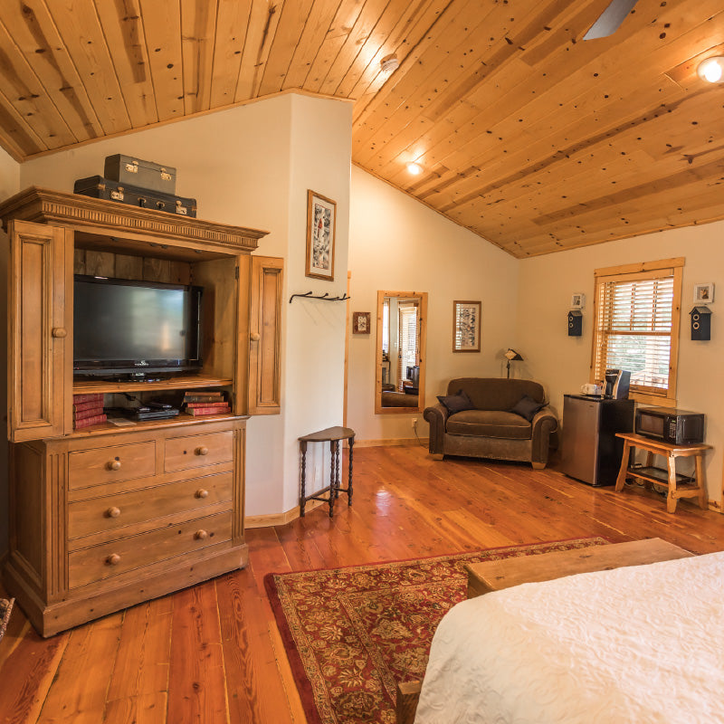 Mustang is a luxury one room cabin nestled in the trees with a King bed and jaccuzzi tub.