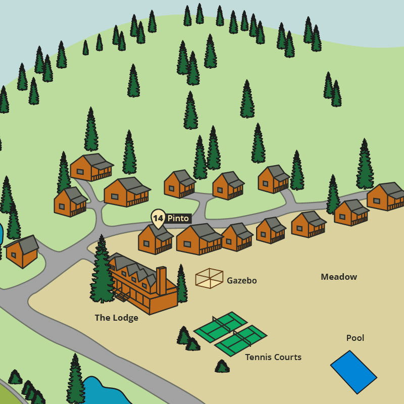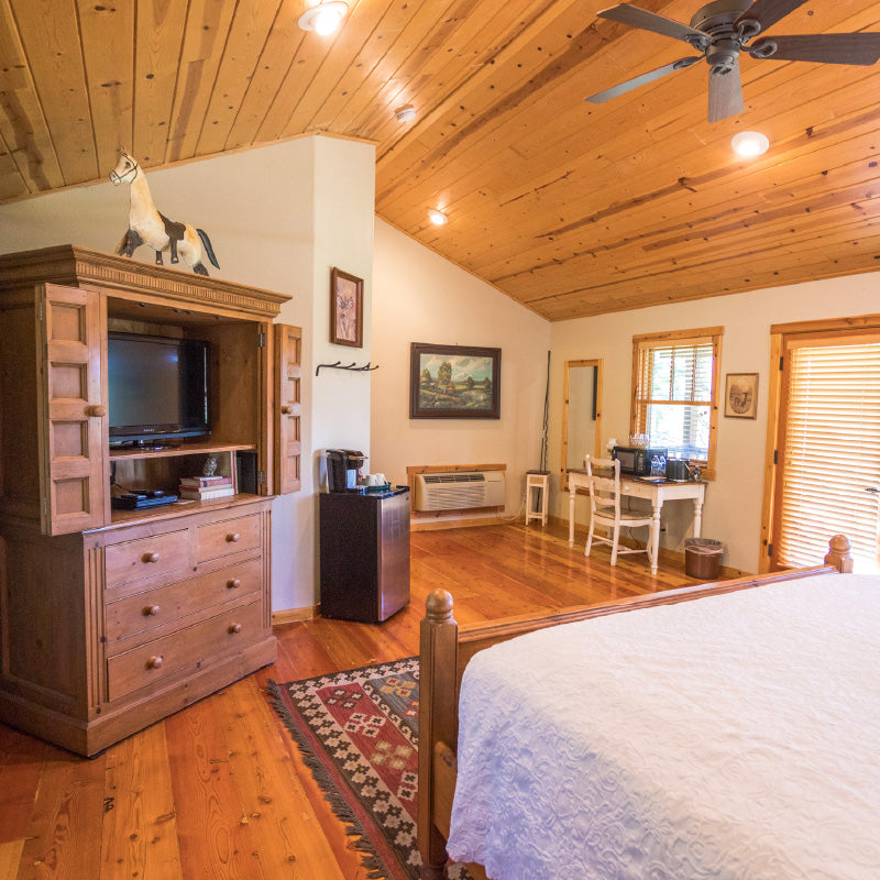 Pinto is a studio cabin with one bathroom and a meadow view. This cabin has a king bed and a lovely living room area.