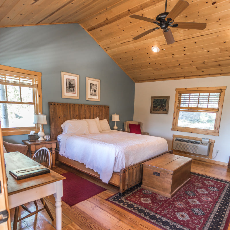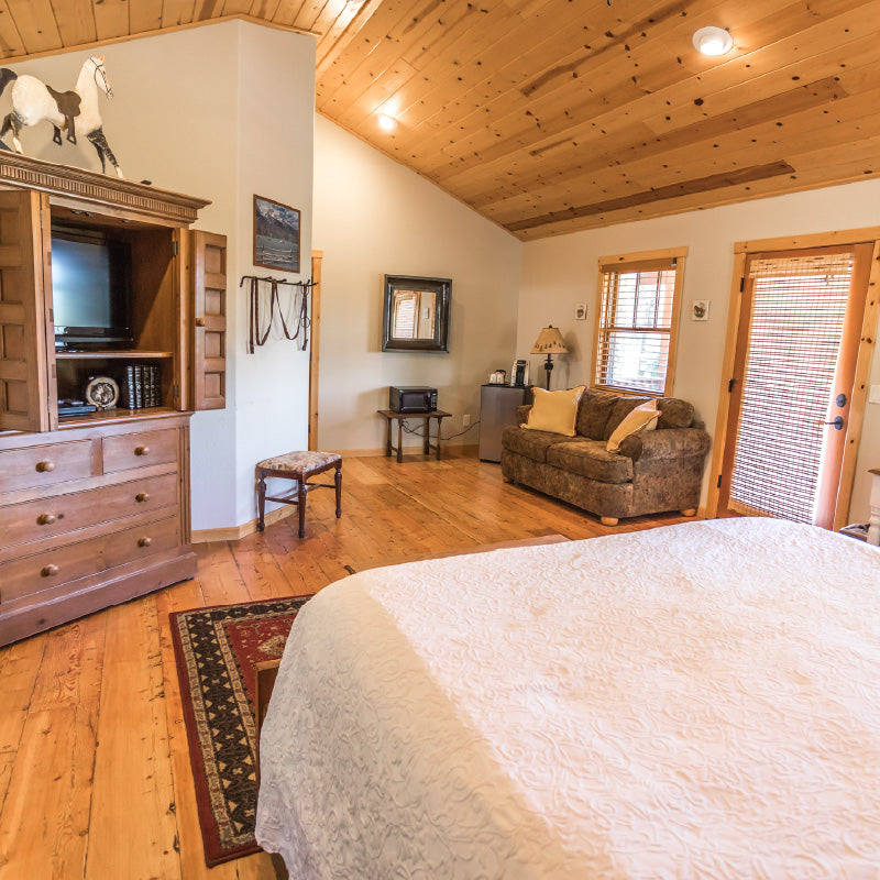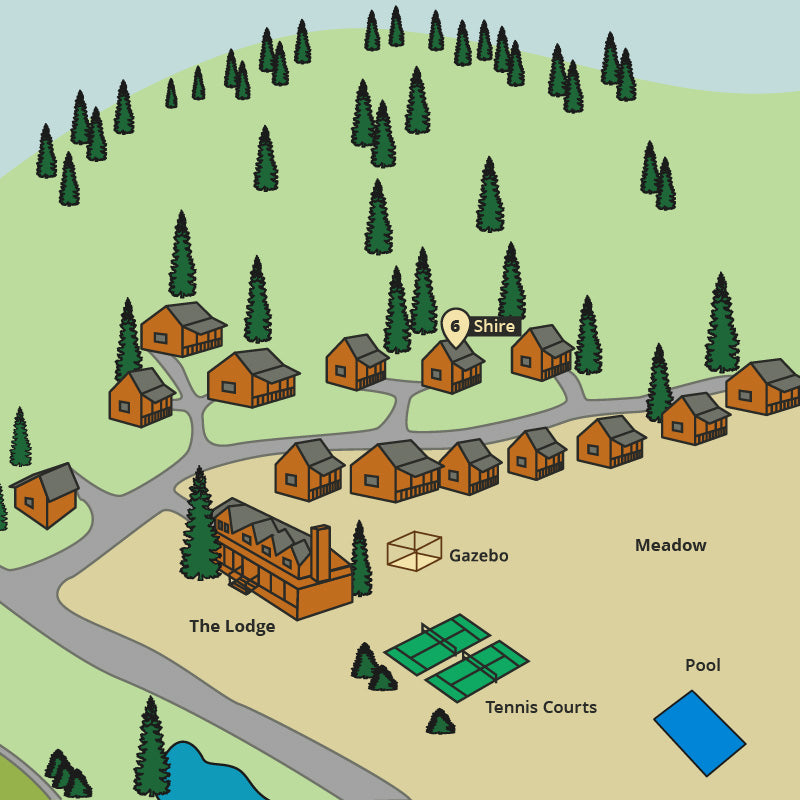 Shire is a luxury one room cabin nestled in the trees with a King bed, sleeper sofa and jaccuzzi tub.